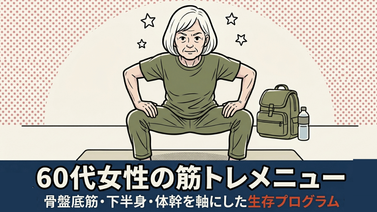 種目別フォームと体系的なメソッドはここ。スクワット・体幹・下半身。重装備で歩くための防災体力を段階的に積み上げる。