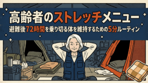 もっと体全体をほぐしたい場合は[高齢者のストレッチメニュー|避難後72時間を乗り切る体を維持するための5分ルーティン]で、朝晩のルーティンを確認してほしい。
